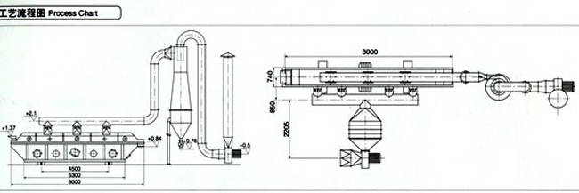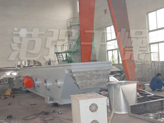 物料自進料進口進入機內,在振動力作用下,物料沿水平面流化床拋擲,向前連續運動,熱風向上穿過流化床同濕物料換熱后,濕空氣經旋風分離器除塵后由排風1:3排出.干燥物料由排料進口排出。