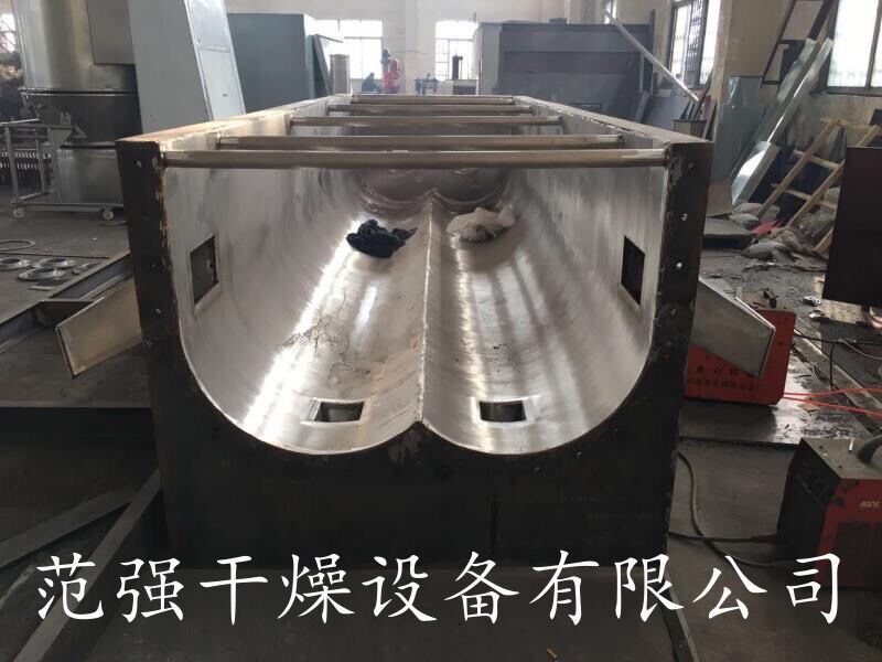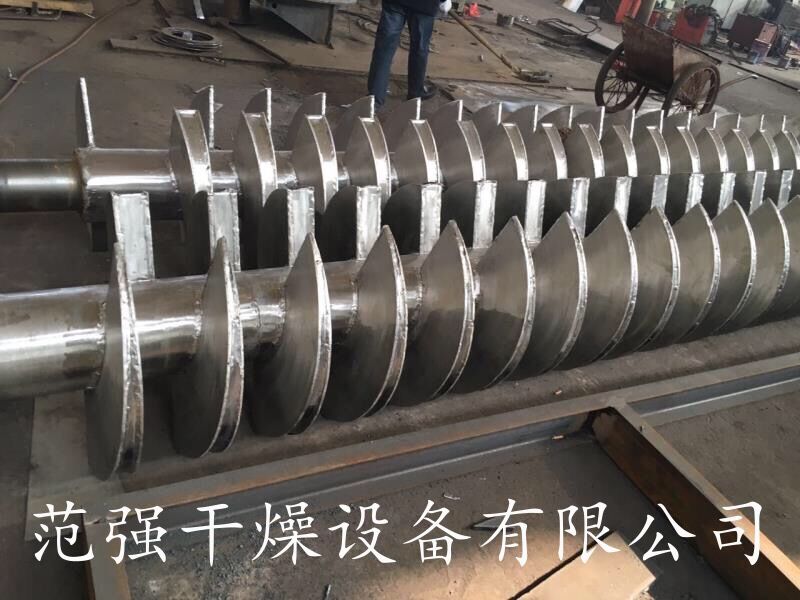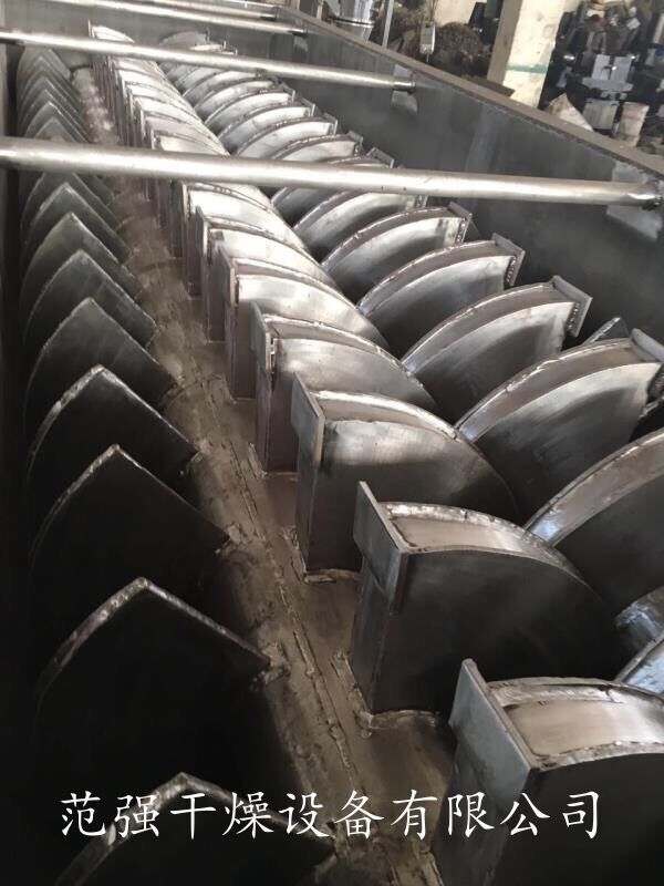空心軸上密集排列著楔型中空漿葉,熱介質經空心軸流經漿葉。單位有效容積內傳熱面積很大,熱介質溫度從-40℃到320℃,可以是水蒸汽,也可以是液體型:如熱水、導熱油等。間接傳導加熱,沒有攜帶空氣帶走熱量,熱量均用來加熱物料。熱量損失僅為通過器體保溫層向環境的散熱。楔型漿葉傳熱面具有自清潔功能。物料顆粒與楔型面的相對運動產生洗刷作用,能夠洗刷掉楔型面上附著物料,使運轉中一直保持著清潔的傳熱面。漿葉干燥機的殼體為Ω型,殼體內一般安排二到四根空心攪拌軸。殼體有密封端蓋與上蓋,防止物料粉塵外泄而充分發揮作用。