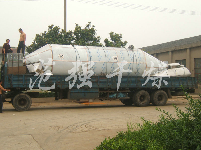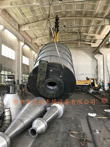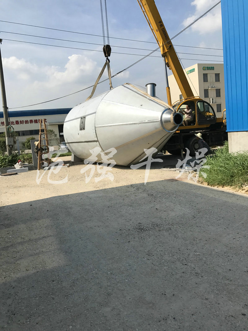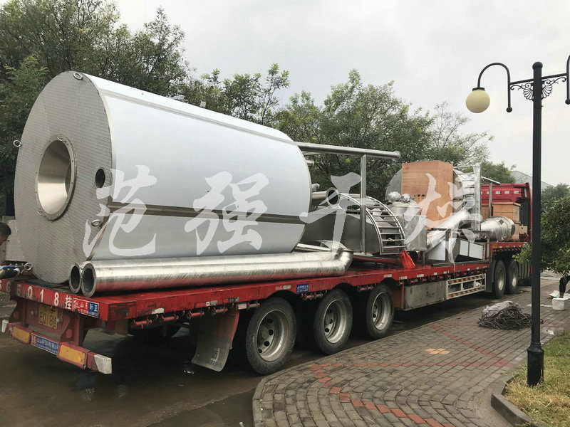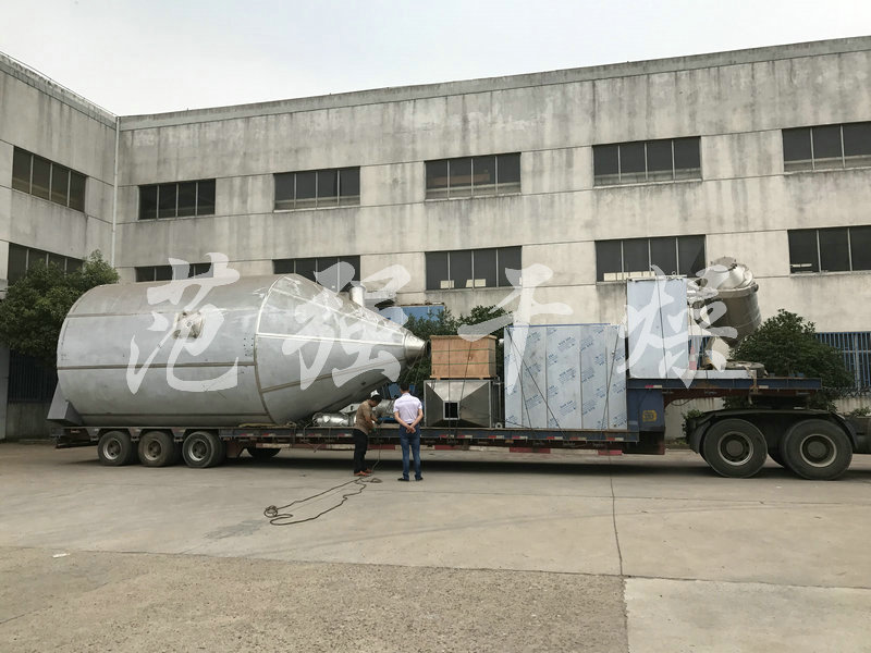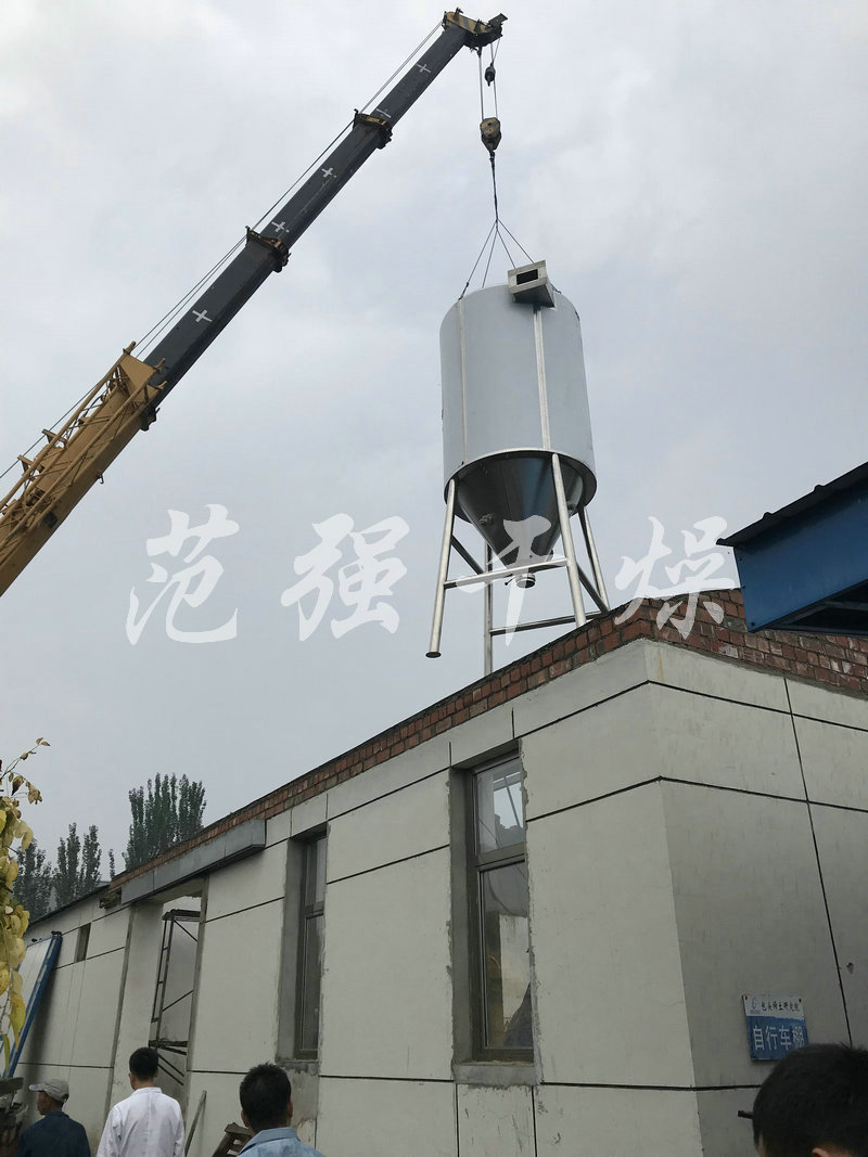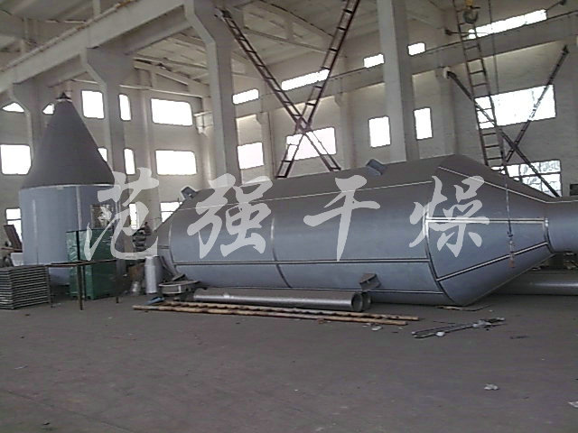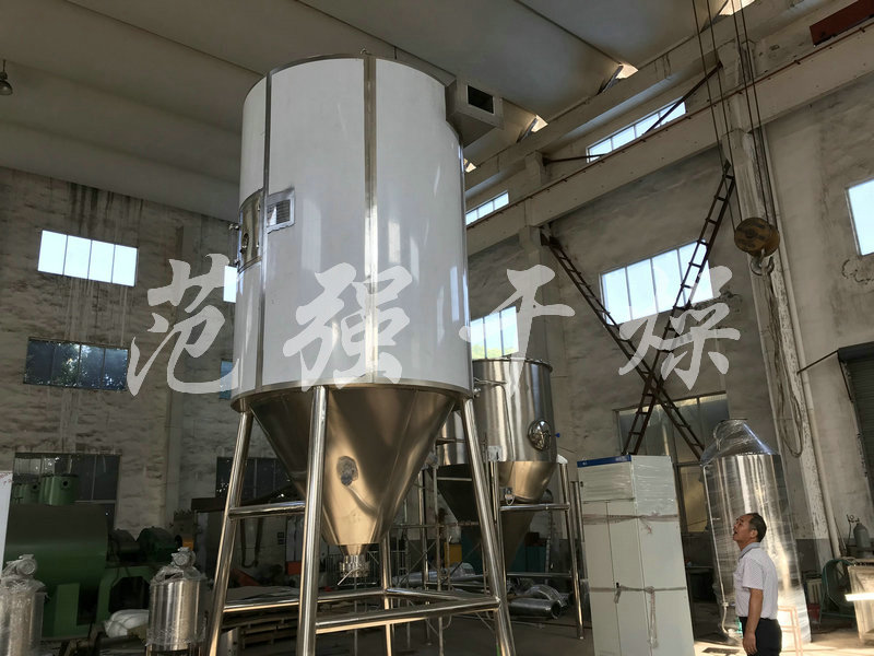 空氣經過濾和加熱,進入離心噴霧干燥機/塔頂部空氣分配器,熱空氣呈螺旋狀均勻地進入干燥室。料液經塔體頂部的高速離心霧化器,(旋轉)噴霧成極細微的霧狀液珠,與熱空氣并流接觸在極短的時間內可干燥為成品。成品連續地由干燥塔底部和旋風分離器中輸出,廢氣由風機排空。