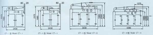 | 行業標準型號 | 技術參數 型號規格 | 每次干燥量 (kg) | 配用功率 (kw) | 耗用蒸氣 (kg/h) | 散熱面積 (m2) | 風量 (m3/h) | 上下溫差 (oC) | 配用烘盤 | 外形尺寸 面寬×深度×高 | 配套烘車 | 設備重量 |